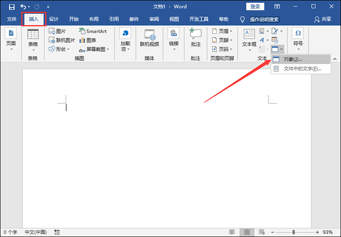 1、我们点击进入“插入”界面,然后在“文本”栏中点击“对象”,继续点击菜单中的“对象”。