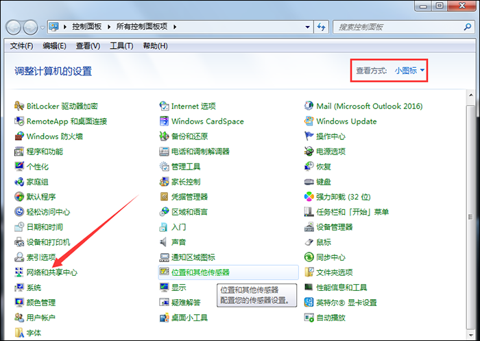 1、点击电脑左下角的“开始”按钮,打开电脑中的“控制面板”。然后在“调整计算机的设置”界面中设置“查看方式”为小图标,然后点击进入“网络和共享中心”。