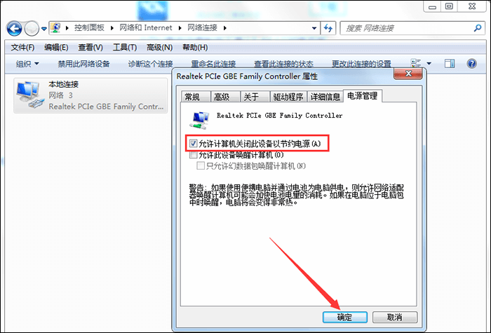 2、然后在Realtek PCIe GBE Family Controller属性界面中勾选“允许计算机关闭此设备以节约电源”,点击“确定”就可以了。