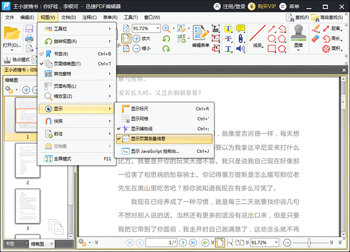 1、下载安装并打开迅捷PDF编辑器,然后直接拖拽PDF文件进去。接着点击页面中的“视图”,我们可以点击“显示”设置阅读显示。
