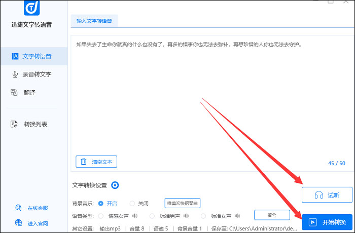 完成以上设置后,点击试听,来体验文字转语音的转换效果如何。如果你觉得好。那么点击开始转换即可。