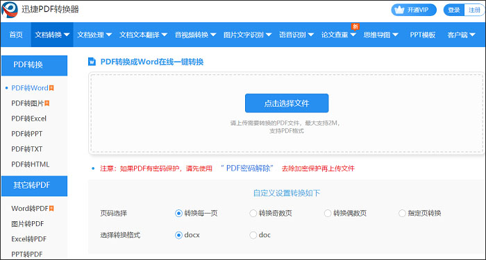 首先在浏览器搜索并且打开迅捷PDF转换器在线网站,在在线网站首页,我们可以找到多种实用功能,包括文档转换、文档处理在内。点击“文档转换”-“PDF转Word”,开始准备转换。