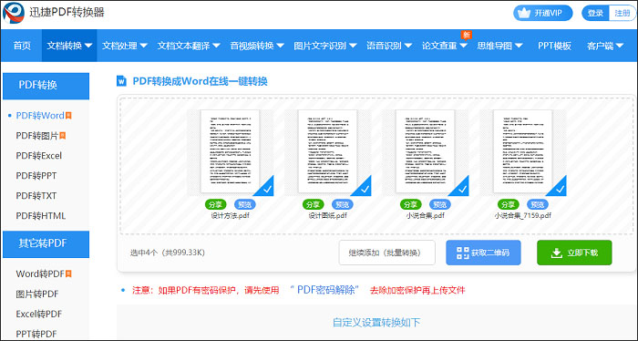 PDF转Word的速度很快,转换成功后,有两种保存方式可以选择。包括点击立即下载将文档保存在电脑中,点击获取二维码,将文档保存在手机里。