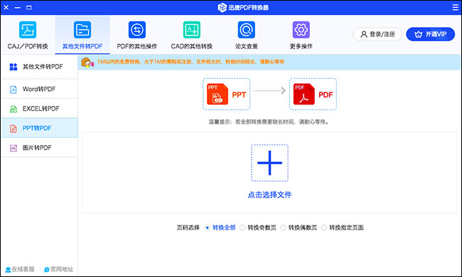 进入Mac浏览器之后,在搜索框输入迅捷PDF在线网站,然后就可以在该PDF网站选择PPT转PDF。在转换文件之前,我们需要将要转换的PPT文件给上传一下,并且将转换的页码给设置好,即可进行转换。