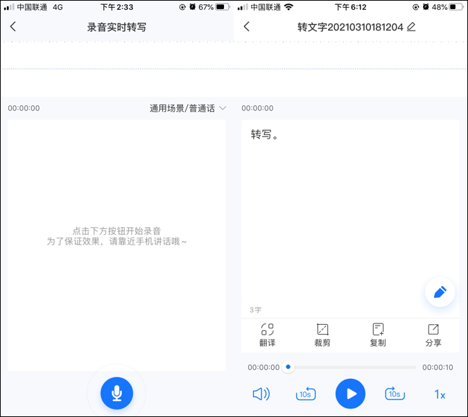 在语音录制的过程中会进行文字的实时转写,待语音录制好之后,文字也就转换好了,点击保存按钮后,可对转换出来的文字进行翻译、裁剪、复制、分享等一类的操作。并且点击页面中的铅笔工具还可以对转换出来的文字进行编辑。