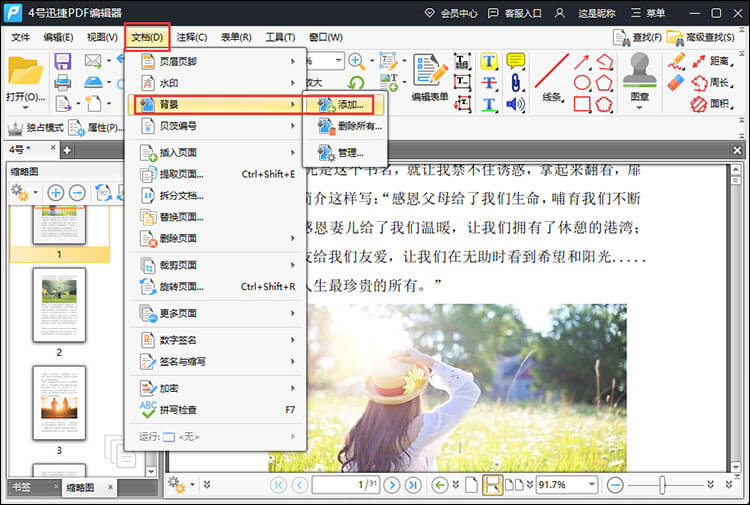 PDF文件在迅捷PDF编辑器中打开之后,大家点击功能栏目处的文档,选择【背景】功能,从背景功能中点击添加选项,之后会弹出添加背景的窗口。