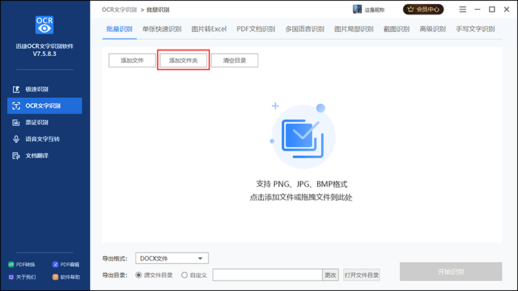 选择批量识别功能后,我们可以点击【添加文件夹】,这样就可以一次上传多张图片资料了。不过大家在添加图片之前,需要我们将对应的图片都整理到一个文件夹中。