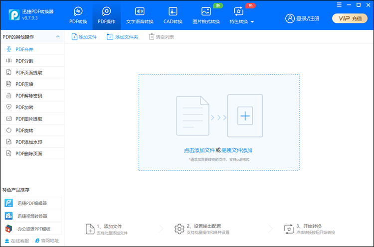 在电脑上合并PDF文件时,是需要借助工具的,小编常用的工具就是迅捷PDF转换器,该软件的主要功能是文件转换,但是也是支持PDF一系列操作的,例如PDF合并、PDF分割、PDF压缩、PDF页面提取、PDF解除密码等。
