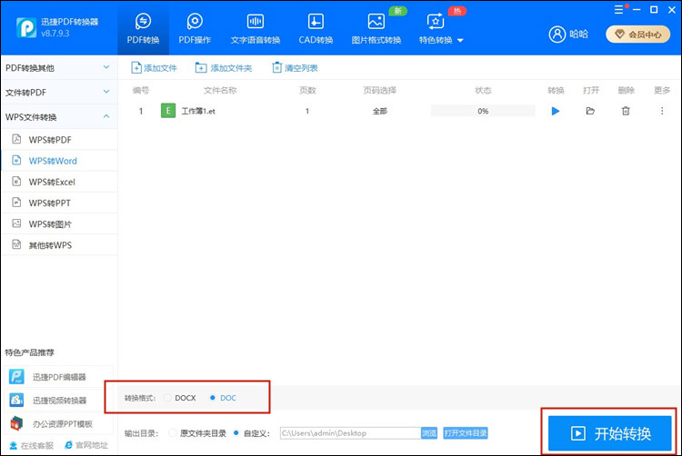 将WPS表格导入完成后,我们看到下方有个【转换格式】选项,我们可以根据自身实际情况选择转换后的格式,最后点击【开始转换】按钮就可以啦~