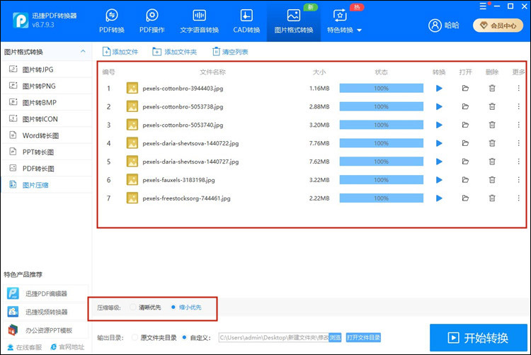 将照片导入完成后,选择【压缩等级】功能,并将它设置为【缩小优先】,最后点击【开始转换】就完成了。