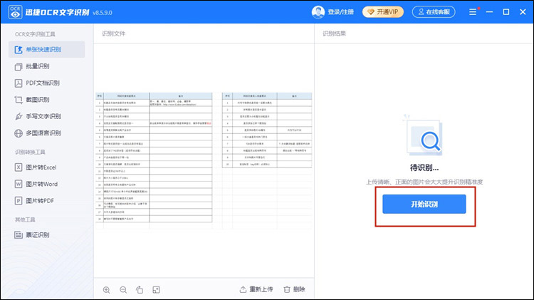 2.将图片导入完后,点击右侧的【开始识别】按钮进行识别操作,稍等片刻后,我们就可以对其文字进行【翻译】、【复制】、【导出识别结果】等操作啦!