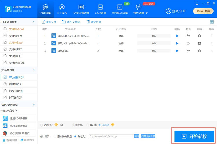2.在【输出目录】中选择文件导出保存的位置, 设置好Word文档导出位置后,点击下方的【开始转换】按钮对其进行转换即可。