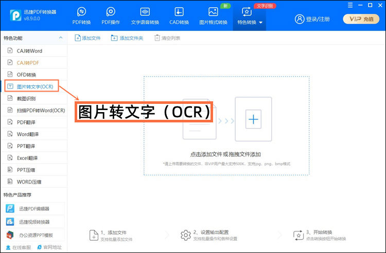 打开这款“迅捷PDF转换器”后,选择上方功能栏中的【特色转换】,然后点击【图片转文字(OCR)】功能,将所有需要识别的图片进行导入。