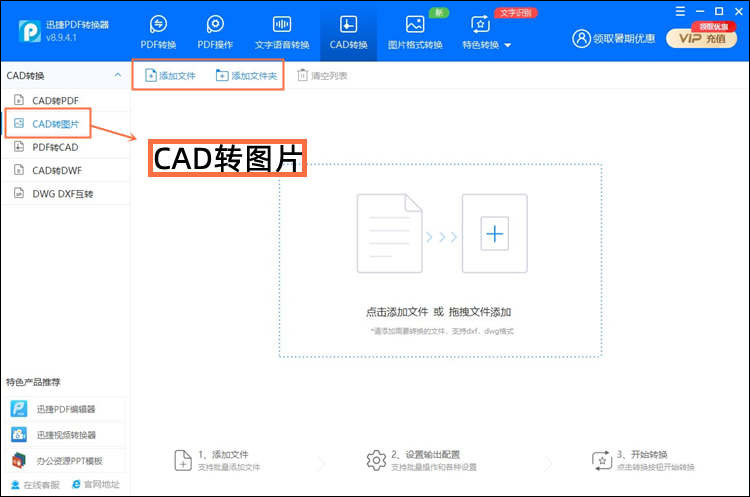 1.在电脑中打开已安装好的软件,点击上方功能栏中的【CAD转换】,并选择左侧功能栏中的【CAD转图片】功能。进入该功能界面后,点击上方的【添加文件】或【添加文件夹】按钮将需要转换的文件添加至软件中。