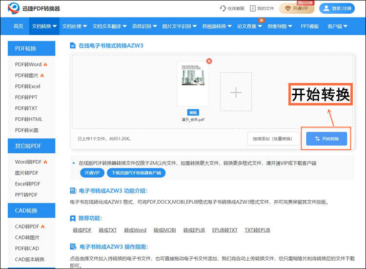 除了使用软件操作外,我们还可以在线操作哦!小编知道可能有那么一小部分小伙伴觉得下载软件比较麻烦,想要有更直接的方法来完成操作,那就选择 “迅捷PDF转换在线网站”吧!在电脑中将这个网站打开,映入眼帘的是丰富的功能,选择【文档转换】中的【电子书转换】,这里不仅可以将电子书转换为AZW3格式,还可以转换为EPUB、TXT等格式哦!点击【转成AZW3】,并进入该功能界面,这时就可以将需要转换的电子书进行导入了。