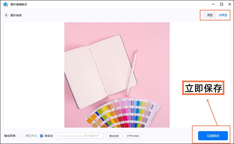 将图片上的水印去除后,我们可以点击右上角的【原图/效果图】按钮对其进行查看。想要将文件保存至电脑中,可以点击下方的【立即保存】按钮。
