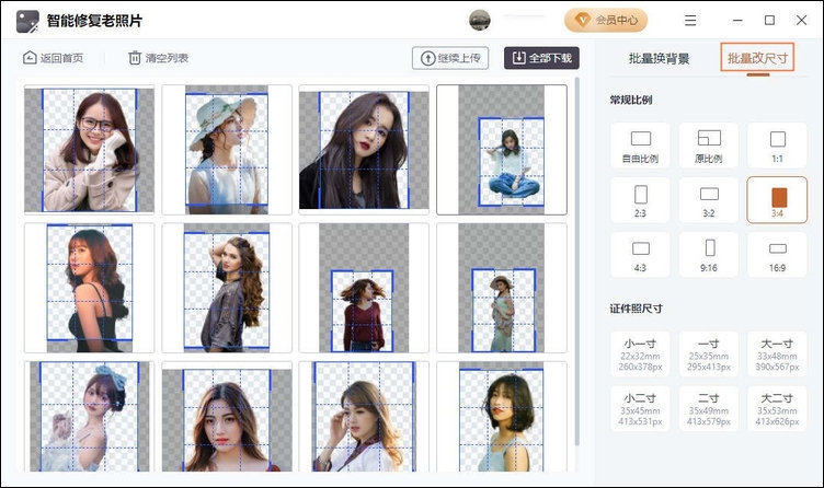 7.使用“批量改尺寸”功能,能够同时修改所有图片的尺寸,可以设置为固定的比例、尺寸进行裁剪修改,同时也支持按比例缩放裁剪区域。