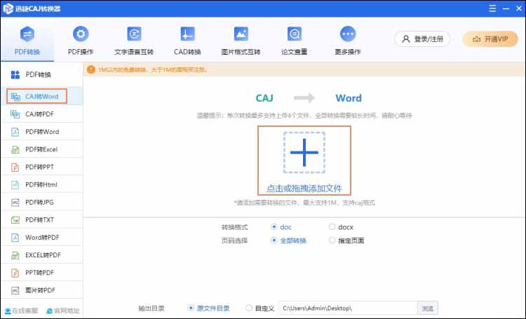 步骤一:点击“立即下载”按钮下载这款软件,打开它并在【PDF转换】一栏选择【CAJ转Word】功能,然后点击功能页面中间的“+”号添加需要转换的CAJ文件,或是直接将CAJ文件拖拽至指定区域。
