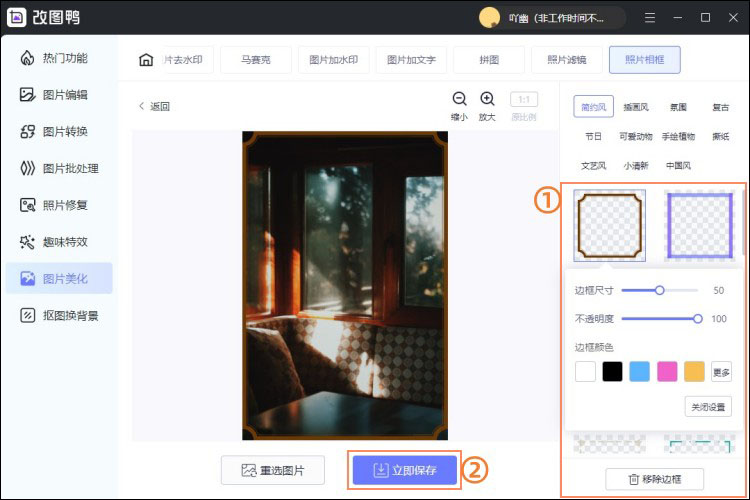 选择好边框后,可以对应调节【边框透明度】、【边框尺寸】以及【边框颜色】,调节好后可以点击【立即保存】按钮将加边框后的图片保存下来。