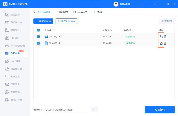 ofd格式文件批量添加至页面后,可以在下方设置转换后文件的保存位置,设置好后可以点击【立即转换】按钮开始文件格式的转换操作。