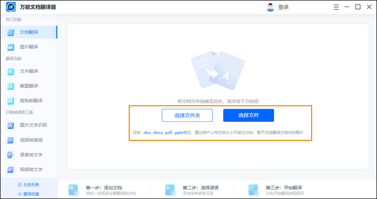 下载并安装万能文档翻译器,完成后选中【文档翻译】,将要翻译的文档一键拖拽到指定区域,或者点击【选择文件/选择文件夹】上传;