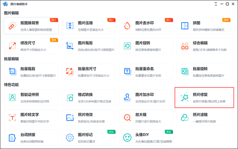 首先打开软件,在软件主页找到对应的【照片修复】功能,点击打开跳转到在线操作界面。