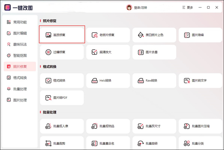 1、打开软件:启动一键改图软件,在界面中选择“照片修复”-“画质修复”功能。