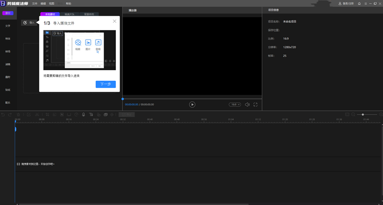 步骤1:下载并打开剪辑魔法师软件,在软件左侧的菜单栏中选择对应的“视频剪辑”功能。选择“文件”菜单,点击“导入”选项。