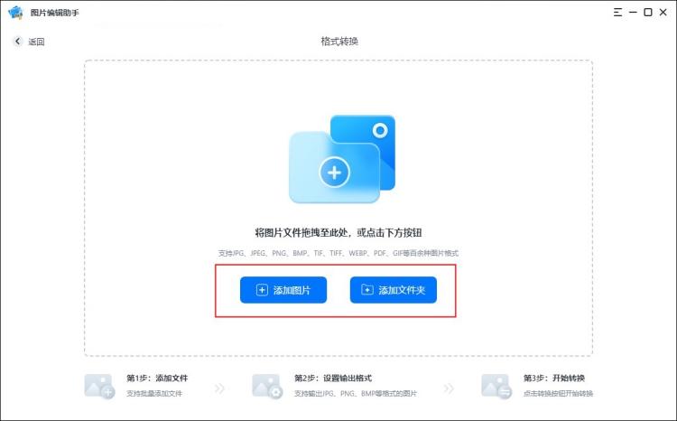 进入转换界面中,我们可以通过点击“添加文件”或“添加文件夹”按钮,将需要转换的图片导入到软件中。同时,还可以批量上传图片进行格式。