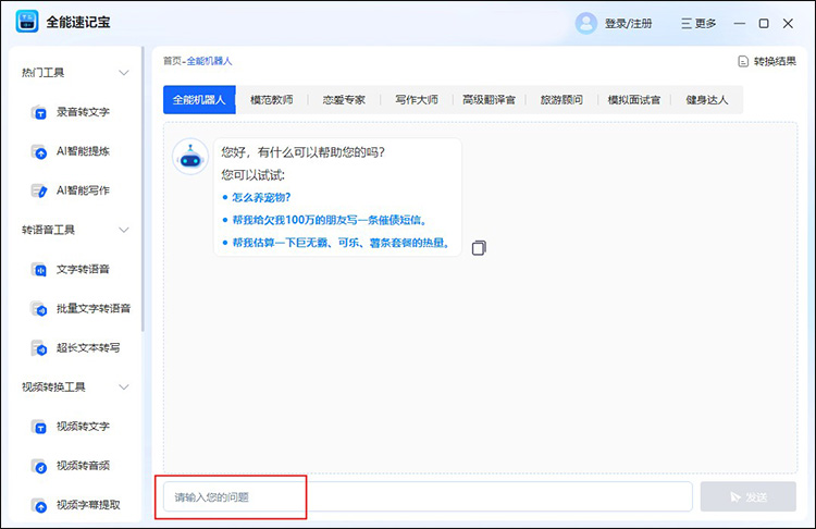 全能速记宝具备与人对话互动、回答问题、协助创作等多种功能。我们可以按照它提供的功能进行测试使用,比如恋爱专家、模拟面试官、旅游顾问等等。