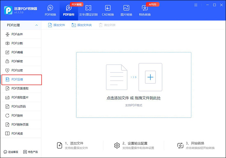 选择“PDF压缩”功能。点击“添加文件”按钮,将需要压缩的PDF文件添加到软件中,支持批量添加。