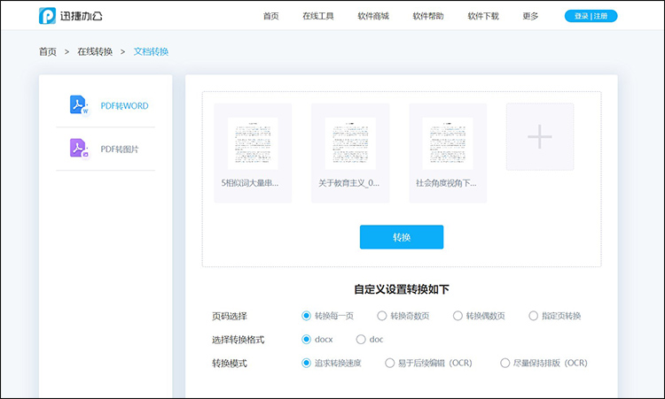 在浏览器上进入迅捷办公网站,在主页面下滑选择在线工具,选择【文档转换】-【PDF转word】,点击添加文件,将需要转换的PDF文档上传。