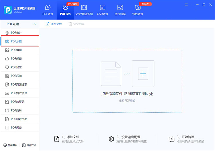 在【PDF操作】-【PDF分割】,导入需要拆分的PDF文件进行拆分。