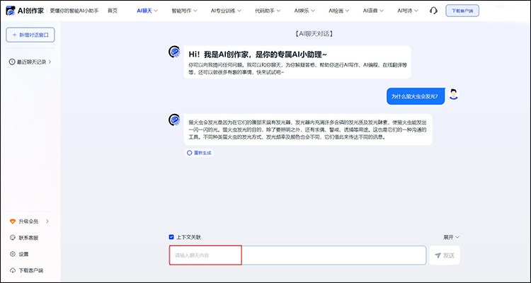 在聊天框中输入你的问题或想说的话,点击发送,AI创作家将迅速给出回应。AI创作家的界面简洁操作也简单,是许多小伙伴的理想选择。