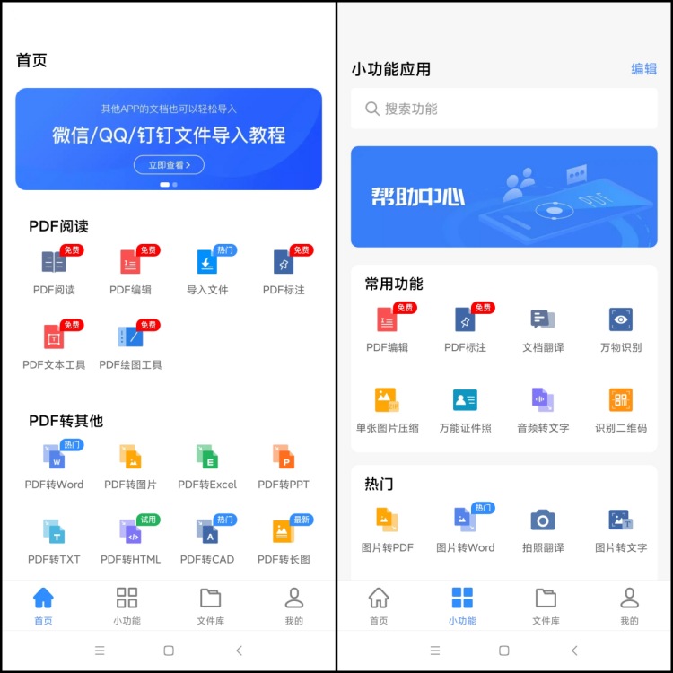 如果你的身边没有电脑,通过使用手机,也能完成PDF文件的合并。首先,需要在手机安装迅捷PDF转换器APP,随后,打开软件在小功能界面寻找PDF合并功能。