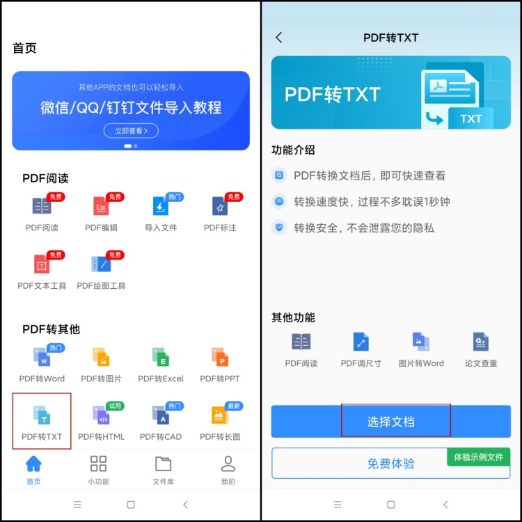 ②选择“PDF转TXT”功能,将PDF文件导入软件中。