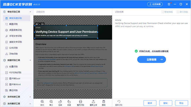 4.点击【开始识别】,软件将自动识别图像中的文字并转换为文本格式。识别完成后,可选择复制、翻译、导出。