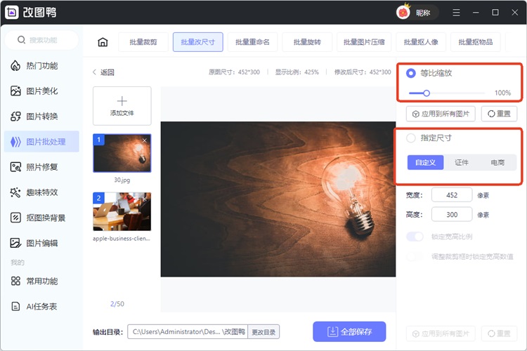 2、我们可以一次性导入多张图片素材,使用尺寸模板或者指定尺寸大小都可以,最后点击【全部保存】即可。