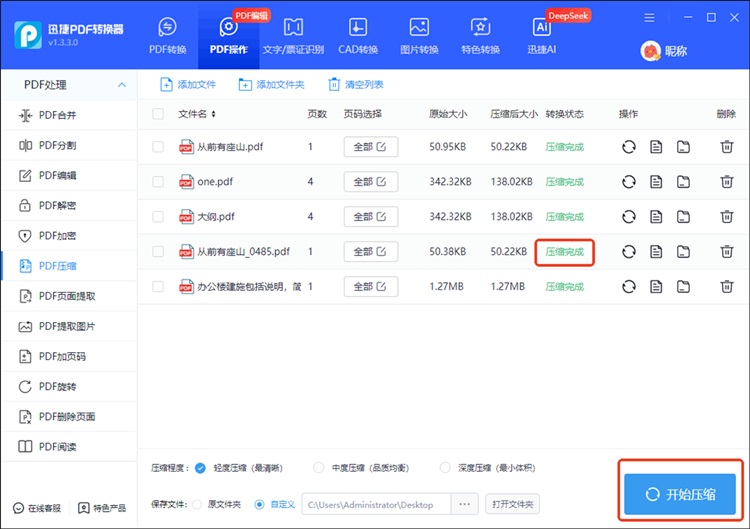 迅捷PDF转换器是一款综合性的PDF处理软件,支持批量压缩PDF文件,可以一次性导入多个PDF文件同时压缩,不用排队逐个添加,还提供了不同的压缩等级选择,可以根据需要在文件体积和画质之间找平衡。