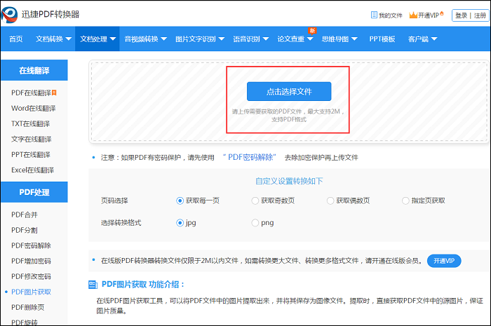 2、接着点击页面中的“点击选择文件”将PDF文件添加进去就可以了。