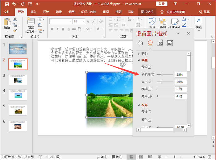 我们选中PPT中的图片,然后鼠标右击,选择“设置图片格式”,然后在效果栏里点击“发光”,然后在“透明度”中调整图片发光透明度就可以了。